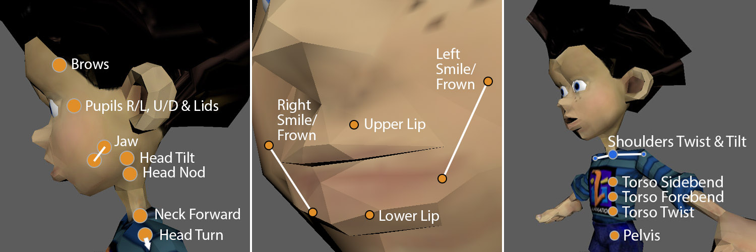 The point is that there needs to be a balance in the functions that make up a performance. Too much reliance on just eyes and mouth and you'll only be able to hold the stage for very specific staging options for a pretty short amount of time. For a full-sized, fully-loaded human figure the common functions available really only are effective at keeping the upper body, arms and head alive - the hips and legs only provide supplementary movement that help the chest and shoulders move appropriately. It's best to hide the lower body or de-emphasize it as much as possible unless extraordinary steps are taken. In this case, we are mainly selling the face, but similarly need the larger head controls and some support from the torso to keep the figure alive for most staging situations.
