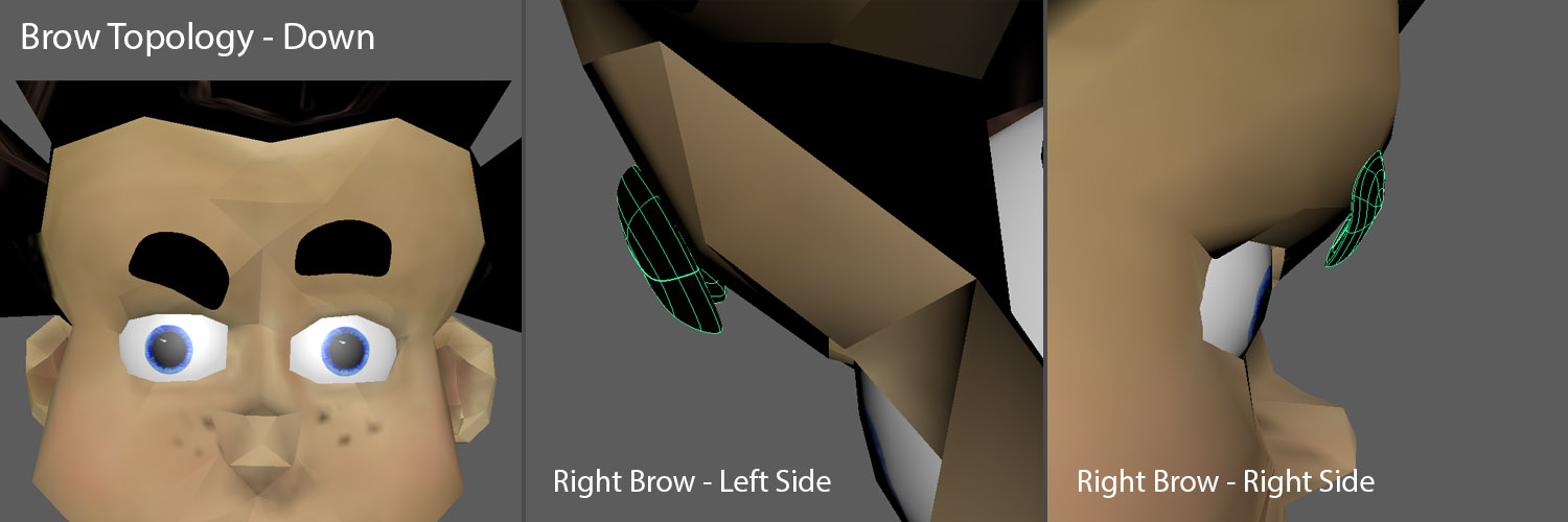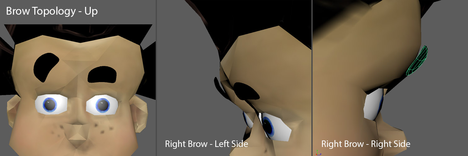 As humans, we can't really do that much with our eyebrows. Some folks have more ability to create variation than others, but basically there is a relaxed position, a subtle drop for furrowing, some small ability to 'knit' the brows toward the center and crease forehead skin a little, and a fairly broad movement of the inner brow up into the forehead to indicate surprise, fear and excitement. Not a lot of complexity, but still, just getting that human range-of-motion can be a challenge, mainly due to the need for a very elastic material to accomodate the stretching needed for 'surprise' and the tight tolerances and firm attachments needed around the lids and eyeball.