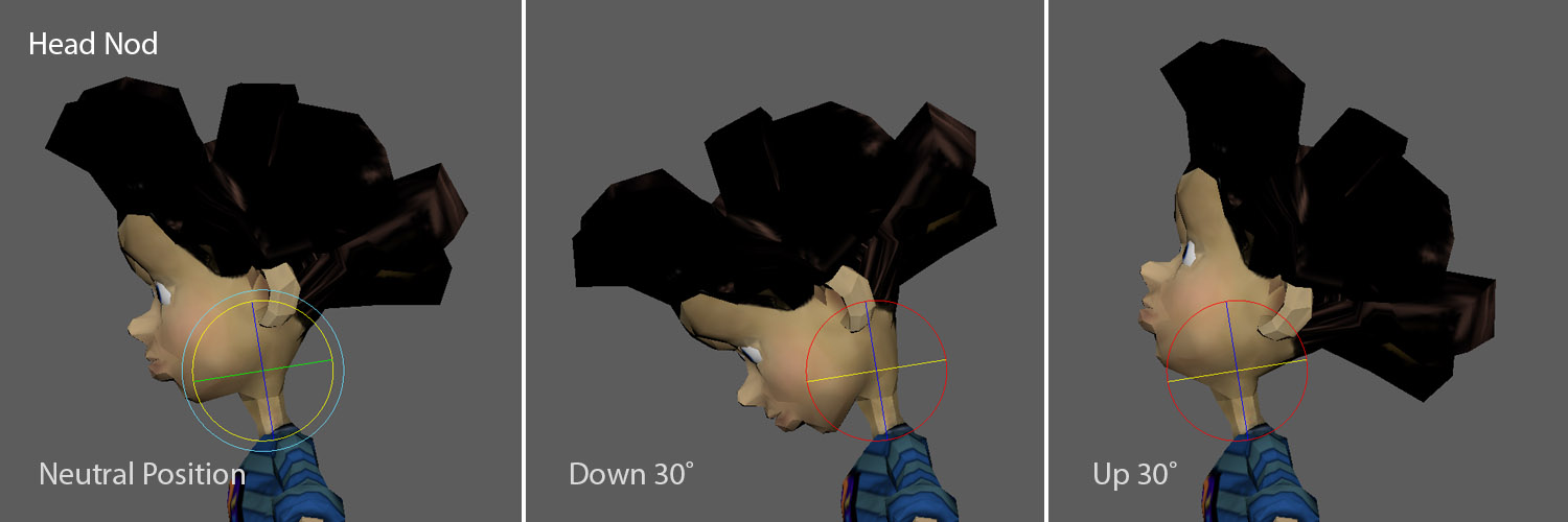 • Head Nod - Rotation near the base of the skull on the X-axis (Y-up).