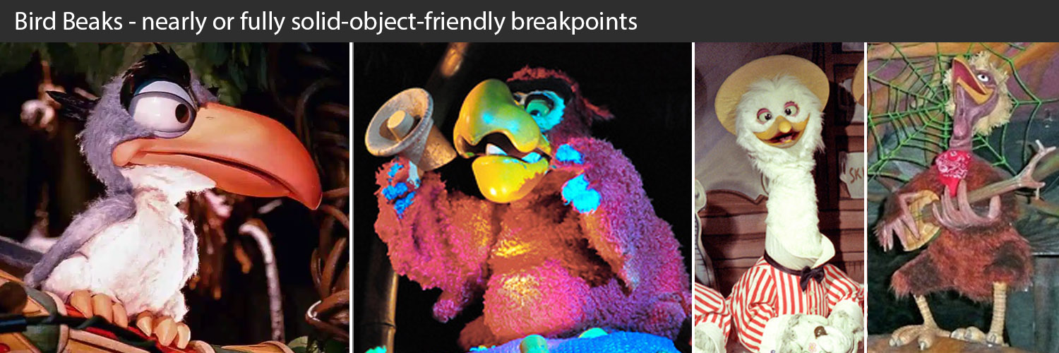 Abstract characters ratchet up the difficulty tremendously, as cartoon eye expression breaks lots of rules to exaggerate all the small, subtle cues in human expression. Cues that originate with a slight furrow and knit get abstracted into changing eyelid shapes to accentuate anger/focus along with having the entire brow ridge collapse down over the eyeball. Cartoon vocabulary completely re-writes the real-world motion for dramatic impact, and that then has to, somehow, be designed into our physics-contrained mechanical design. Some days that just seems incredibly unfair. To the point that we look for other ways to address eye expression. More on that tomorrow.