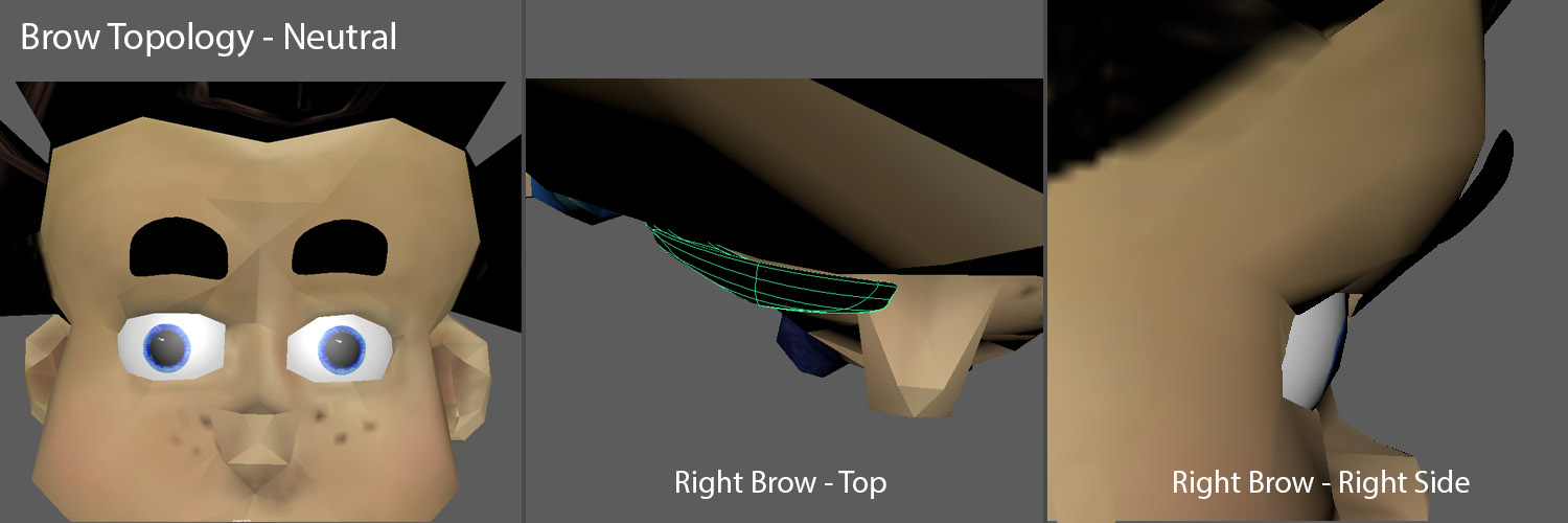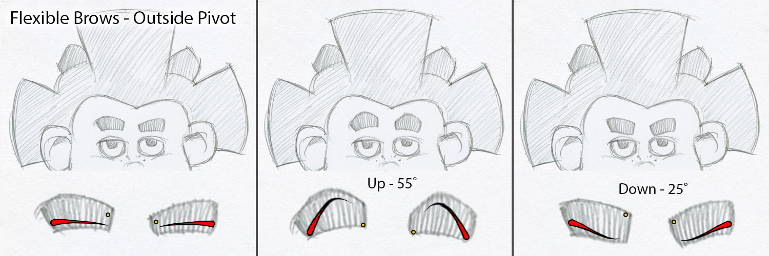 As humans, we can't really do that much with our eyebrows. Some folks have more ability to create variation than others, but basically there is a relaxed position, a subtle drop for furrowing, some small ability to 'knit' the brows toward the center and crease forehead skin a little, and a fairly broad movement of the inner brow up into the forehead to indicate surprise, fear and excitement. Not a lot of complexity, but still, just getting that human range-of-motion can be a challenge, mainly due to the need for a very elastic material to accomodate the stretching needed for 'surprise' and the tight tolerances and firm attachments needed around the lids and eyeball.