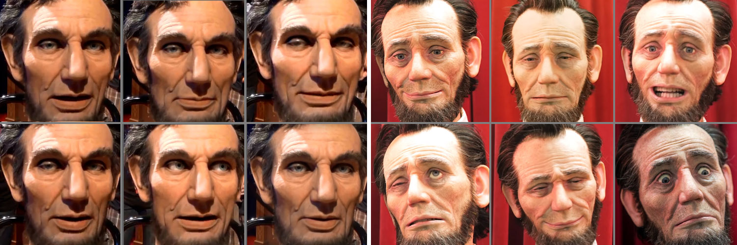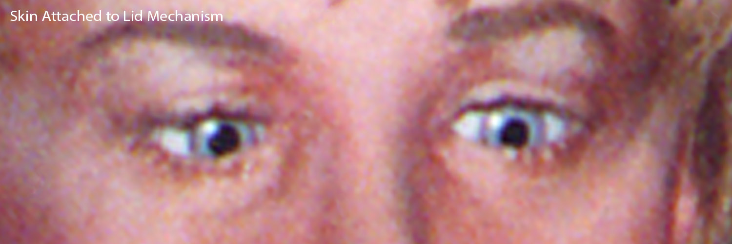 There is a basic rule of mechanical design for high-duty-cycle applications (like theme parks): Things that move can't touch other things. This is an extremely unfortunate rule and maybe the one that has the most significant impact on animatronic design. It certainly is problematic when it comes to the mouth and eyes. Basically, there has to be a gap between the eyeball and the lid. And if the eyelid is a separate mechanism from the face skin, there has to be a gap between the lid and skin. These gaps look awful. Our eyes constantly 'lube' our eyeballs to maintain a nice smooth surface for our eyelids to rub against, and I suspect that there is still an awful lot of cellular upkeep to keep our lids and eyeballs in proper working order. We don't get that (yet) in the mechanical world, so even with tight tolerances eyes still look pretty nasty.
